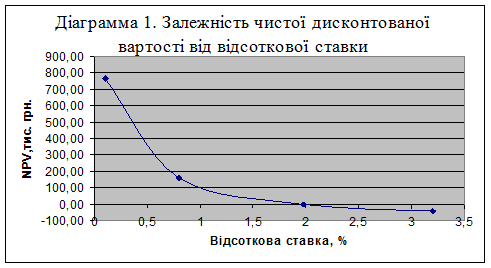 При розрахунку економічної ефективності інвестиційного проекту методом чистої дисконтованої вартості було отримано значення NPV=766,52 тис. грн. При зростанні рівня відсоткової ставки інвестиція може перейти з категорії вигідних в категорію невигідних. Виходячи з динамічності відсоткової ставки в залежності від ситуації на ринку капіталу та умов фінансування проекту, можна вважати недоліком методу чистої дисконтованої вартості неоднозначність характеристики.
