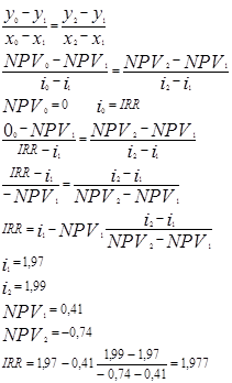 При розрахунку економічної ефективності інвестиційного проекту методом внутрішньої ренти було отримано значення IRR=197,7%, тобто інвестиція буде мінімально ефективною (NPV=0) при значенні IRR=197,7%. Якщо IRR>і то NPV>0, тобто інвестиція є ефективною. Якщо IRR=і то NPV=0, тобто інвестиція є мінімально ефективною. Якщо IRR<і то NPV<0, тобто інвестиція є неефективною.