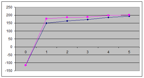 При визначенні усередненого терміну окупності статистичним методом було встановлено, що інвестиція окупається менш ніж за один рік. Усереднений період окупності, як і всі усереднені показники, має при значних коливаннях поточних платежів суттєві погрішності. Тому більш часто використовується метод накопичення платежів, відповідно до якого період окупності встановлюється зіставленням суми інвестованих витрат з кумулятивним чистим грошовим потоком. При розрахунку таким методом термін окупності виявився меншим за один рік. Але цей метод є неефективним, тому що не враховує фактор часу.