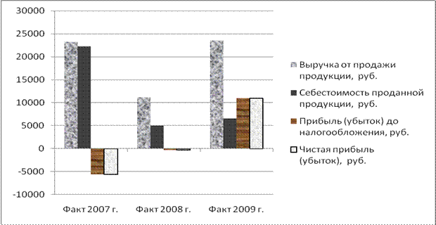 Предприятие начало производственную деятельность в 2007 году, высокие затраты на организацию функционирования цехов производства вызвали увеличение себестоимости произведенной продукции при ограниченном выпуске и соответственно незначительной выручке от продажи продукции, что привело к отрицательным финансовым результатам. Но уже к 2009 году ситуация кардинально меняется наблюдается увеличение прибыли до налогообложения и как следствие увеличение чистой прибыли. Если в 2007 и 2008 году наблюдается убыток, но вместе с тем уже в 2008 году снижение убытка на -5278 тыс.руб., то в 2009 году относительно 2008 года наблюдается увеличение прибыли до налогообложения на +11242 тыс.руб., темп снижения убытка составил -3673%.