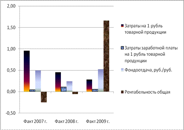 Это в значительной степени повлияло на уровень рентабельности. По итогам 2007 и 2008 гг. предприятие нерентабельно, но уже в 2009 году рентабельность составляет 165,79%. Темп роста рентабельности в 2009 году относительно 2008 года составляет 2804%.