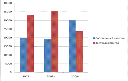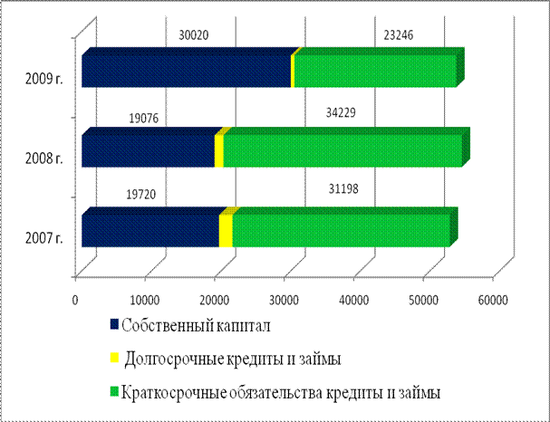 Анализируя структуру источников формирования капитала предприятия ООО «КФ Жигулевская» в 2009 году, можно сказать, что наибольший удельный вес в капитале предприятия занимает заемный капитал, его доля в общей структуре составила 65,05% на конец анализируемого периода, заемный капитал уменьшается и составляет 44,19%. На конец 2009 года наблюдается увеличение суммы собственного капитала на +10 944 тыс.руб., если в 2008 году собственный капитал составлял 34,95%, то в 2009 году уже составляет 55,81% в общей структуре капитала произошло перераспределение в сторону увеличения доли собственного капитала на +20,86% и уменьшение заемного капитала на -20,86%.