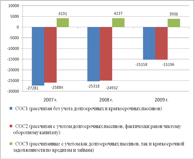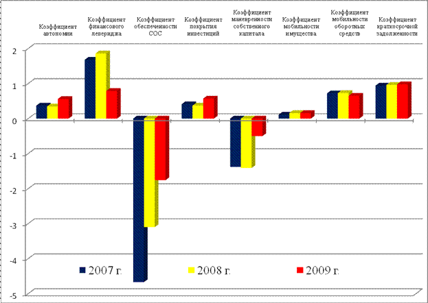 На конец анализируемого периода в 2009 году коэффициент обеспеченности собственными оборотными средствами равнялся -1,76. При этом, значение коэффициента не удовлетворяет нормативному, находясь в области критических значений.