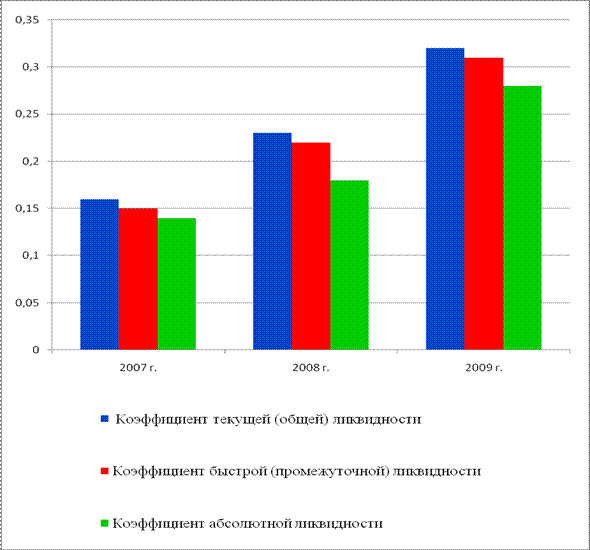 Показатели ликвидности позволяют определить способность предприятия оплатить свои краткосрочные обязательства, реализуя свои текущие активы. У ООО «КФ Жигулевская» недостаточно активов, которые можно в сжатые сроки перевести в денежные средства, чтобы погасить краткосрочную кредиторскую задолженность. Значения коэффициента быстрой ликвидности в течение всего анализируемого периода не укладывались в нормативные. Коэффициент абсолютной ликвидности имеет значение, соответствующее норме (0,28). При этом за анализируемый период (с 2007 по 2009 гг.) коэффициент вырос на 0,14 пункта.