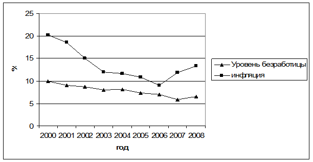 Рисунок Б.4 — Динамика уровня безработицы и темпов инфляции в 2000-2008гг.