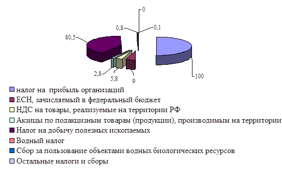 Наибольшее поступление в бюджет происходит за счет платежей по налогу на добычу полезных ископаемых. В структуре их доля составляет в 2007 г. – 48,3%, в 2008 г. -44,1 %, в 2009 г. -53,9%. Налог на прибыль в организации в структуре консолидированного бюджета РФ занимает по величине доли второе место и составляет в 2007 г. – 15,7%, в 2008 г. – 21,8%, в 2009 г. – 21,0%.