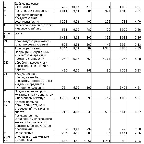В 2008 г. высокие значения показателя зафиксированы для следующих видов деятельности (ОКВЭД):