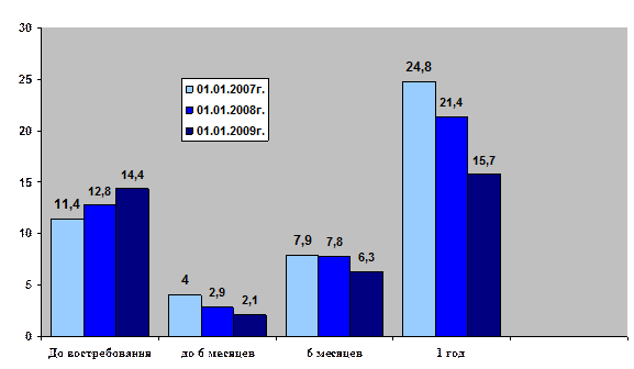 В соответствии с правилами ведения бухгалтерского учета в банках срочные депозиты классифицируются по следующим срокам: до 30 дней; 31 – 90 дней; 91 – 180 дней; 181 день – 1 год; 1 – 3 года; свыше 3 лет[23] .