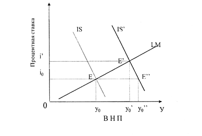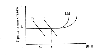Если экономика находится в ликвидной ловушке, при которой кривая LM горизонтальна, рост государственных расходов имеет максимальное влияние на равновесный уровень дохода. Ставка процента не меняется, следовательно, нет тормозящего действия роста госрасходов на национальный доход.