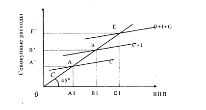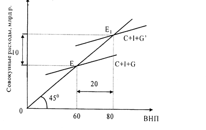 Покажем суть этого мультэффекта. Предположим, что при данном уровне потребления, инвестиций и государственных расходов равновесное состояние макроэкономики достигается в точке Е при объеме ВНП, равном 60 млрд. р. (рисунок 6).