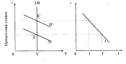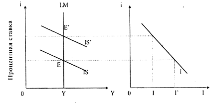 Рост госдоходов сдвигает кривую IS до положения IS ', но не оказывает влияния на доход. Если спрос на деньги не восприимчив к изменению ставки процента (как подразумевает вертикальная LM), то существует единственный уровень дохода, при котором денежный рынок находится в равновесии. Таким образом, рост правительственных расходов не изменяет равновесный уровень дохода, а только увеличивает равновесную ставку процента. Но если госрасходы увеличиваются, а уровень доходов неизменен, то это должно компенсироваться снижением личных доходов. Рост ставки процента вытесняет частные инвестиции. Эффект вытеснения , точно определяя значение этого термина, означает снижение частных расходов (особенно инвестиций), в соответствии с ростом ставки процента в случае фискальной экспансии. Когда кривая LM вертикальна, эффект вытеснения будет максимальным. График инвестиций показывает это. Если положительный наклон графика кривой сильнее, чем вертикальный, ставка процента при воздействии фискальной политики увеличивается медленно, и как результат, инвестиции снижаются незначительно. Размеры эффекта вытеснения, таким образом, зависят от наклона кривой LM и, следовательно, от процентной зависимости спроса на деньги. Если в экономике наблюдается полная занятость, то рост товаров и услуг, закупаемых государством, должен означать, что любые другие сектора покупают меньше товаров и услуг в размере, равном наиболее высокомууровню госрасходов.