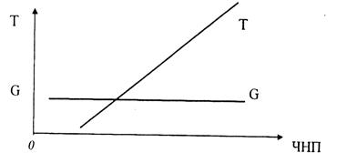 График отображает и падение налоговых поступлений в период, когда ЧНП уменьшается, т. е. падает производство, что ведет к образованию дефицита государственного бюджета ( G > T ). Если бы объем налоговых поступлений сохранился на прежнем уровне во время экономического кризиса, то хозяйственная конъюнктура для бизнеса означала бы более высокие экономические риски, что спровоцировало бы дальнейшее свертывание производства. Значит, уменьшение налоговых поступлений в этот период объективно оберегает общество от нарастания кризиса и ослабляет падение производства.