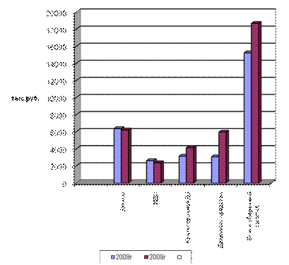 Из рисунка 4 и 5 видно, что в структуре оборотных средств произошли незначительные изменения, а именно за 2008-2009гг. в структуре оборотных средств преобладали запасы. Их доля в 2009г. уменьшилась на 8,67% и составила 33,23%. Данная ситуация объясняется снижением объема и суммы товарных запасов и уменьшения оборотов по продаже товаров.