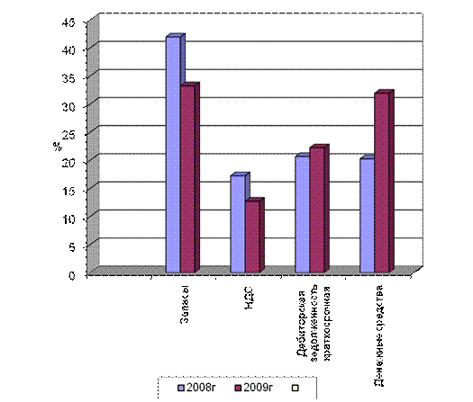 Как видно из таблицы 2.4, в 2009 году по сравнению с 2008 годом происходит снижение доли запасов на 8,67% и НДС — на 4,52%. Снижение запасов говорит о повышение деловой активности предприятия. Рост доли краткосрочной дебиторской задолженности на 1,55% говорит об ухудшении расчетов с клиентами. Рост доли денежных средств на 11,66% является благоприятным моментом.