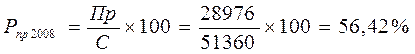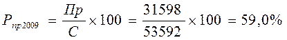 Вывод: предприятие имеет высокую норму рентабельности продукции, которая в 2008 году составляет 56,42%, а в 2009 году – 59,0%. Таким образом видно, что в 2009 году рентабельность продукции выросла на 2,58% т.е. продукция предприятия приносит высокие доходы.
