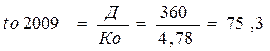 В 2008 году оборотные средства полностью совершали свой кругооборот за 64,1 дня, а в 2009 – за 75,3 дней. Продолжительность оборота в 2009 году по сравнению с 2008 годом увеличилась на 11,2 дня (оборотные средства, проходят полный цикл и снова принимают денежную форму на 11,2 дней медленнее, чем в предыдущем периоде).