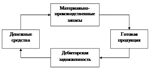 Находясь в постоянном движении, оборотные активы обеспечивают бесперебойный процесс производства. При этом происходит постоянная и закономерная смена форм стоимости: из денежной она превращается в товарную, затем в производственную и снова в товарную и денежную. Таким образом, возникает объективная необходимость авансирования средств для создания нормальных условий производственной деятельности до момента получения выручки от реализации продукции. Кругооборот оборотных (текущих) активов представлен на рис. 1.