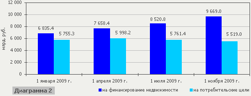 Рост кредитной задолженности в отчетном периоде происходил, в основном, за счет кредитования населения на финансирование недвижимости. Так, кредитная задолженность физических лиц на финансирование недвижимости за январь – октябрь 2009 г. увеличилась на 2 833.7 млрд. рублей или на 41.5 процента и на 1 ноября 2009 г. составила 9 669.0 млрд. рублей, из которых 74.2 процента составляет задолженность по льготным кредитам на строительство и приобретение жилья. [8]