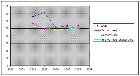 Замедление физических объемов экспорта нефти сказалось, в основном, на снижении общих темпов роста экспорта. Уменьшение темпов роста экспорта нефти в 2008 г. против 2004-2007 гг. связано с увеличением объемов переработки нефти и снижением темпов роста добычи нефти.