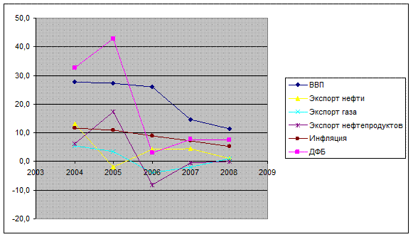 Динамика темпов роста экспорта топливной продукции в 2003-2008* г.г. с учетом ВВП и инфляции