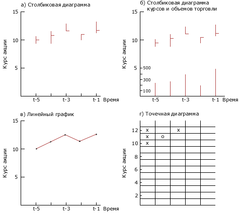 Чартисты (chartists) (инвестиционные аналитики, которые используют в анализе схемы и графики) полагают, что определенные модели имеют большое значение, хотя между собой они часто спорят о значимости той или иной модели либо даже о самом ее существовании. Прежде чем перейти к гипотетическим примерам моделей следует отметить, что существует три основных типа графиков. Это столбиковые диаграммы (bar charts), линейные графики (line charts) и точечные диаграммы (point and charts).