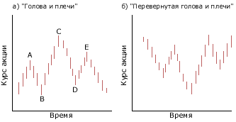 На рисунке 8 (а) показана столбиковая диаграмма, которая представляет модель, известную под названием «голова и плечи». С течением времени курс акции вначале вырос, достиг пика в точке А и затем упал до нижней точки В. После падения он достиг еще более высокого пика в точке С, но затем вновь упал до нижней точки D. Далее он поднялся до пика в точке Е, который не был таким высоким как предыдущий пик С, и затем начал падать. Как только курс упал ниже предыдущего нижнего уровня D, то сразу же был сделан прогноз о том, что курс упадет гораздо ниже (если бы курс акции не достиг уровня D, то такой прогноз не был бы сделан).