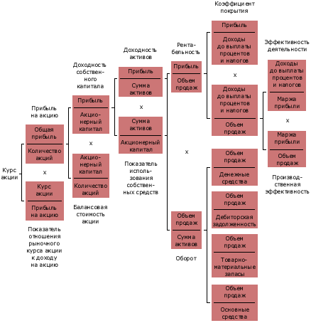 Иной способ использования коэффициентов для анализа показан на рисунке 5. Здесь каждый коэффициент равен произведению двух коэффициентов в его правой части с одним исключением. Исключение составляет коэффициент товарооборота (объем продаж/сумма активов) — его обратное отношение (сумма активов/объем продаж) равно сумме обратных отношений четырех коэффициентов в правой части. Поскольку между коэффициентами существуют взаимосвязи, то, определив будущие значения индексов, можно сделать прогноз в отношении стоимости акций фирмы. Однако сложность такого подхода состоит в точности определения будущих значений коэффициентов.