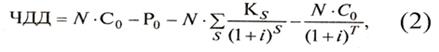 Для дебитора (эмитента) эффективность финансового проекта выражается в получении дополнительного дохода (эффекта) при вложении средств в ценные бумаги в сравнении с доходом, который он мог бы получить, используя альтернативные источники привлечения денежных средств, а также в более позднем возвращении денежных средств инвестору по номинальной стоимости акций в сравнении со сроком их реализации по продажной цене. Учитывая, что момент получения денежных средств от реализации ценных бумаг не совпадает с моментом их возвращения инвестору, эффективность финансового проекта для эмитента облигаций (ЧДД, или NPV) при наличии купонных выплат рекомендуется рассчитывать по следующей формуле.