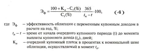 Если облигации выпускают с переменным купонным доходом и предполагают, что облигации могут быть проданы по номиналу после очередной купонной выплаты, то их эффективность исчисляется по следующей формуле: