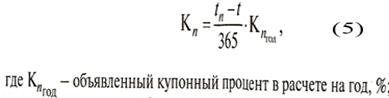Величина очередного купонного платежа (Кn ) рассчитывается за период от момента приобретения инвестором облигации до момента очередной купонной выплаты. Расчет осуществляется по следующей формуле: