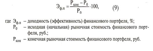 Эффективность диверсификации инвестиций в рыночные ценные бумаги, например, определяется тем, что доходность различных видов ценных бумаг изменяется по-разному. Отсюда проигрыш (убыток) по одним видам ценных бумаг может быть компенсирован выигрышем (дополнительной прибылью) по другим. При этом инвестору необходимо рассчитывать уровень доходности финансового портфеля и контролировать его изменение.