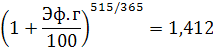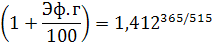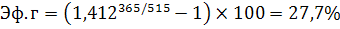 Доходность ГКО в расчете на год (Эф.г ) может быть рассчитана методом сложных процентов, исходя из следующих зависимостей между индексом годовой доходности облигации и индексом доходности облигации за период от момента ее приобретения инвестором до момента ее погашения, где 1,412 — индекс доходности ГКО за период от момента ее приобретения инвестором до момента ее погашения, т. е. за 515 дней. Значение 1,412 получено путем суммирования доходности облигации к погашению, исчисленному выше и равному 41,2%, со 100% и делением полученной суммы на 100. Таким образом, мы переходим от темпа роста доходности к индексу ее роста.
