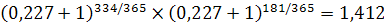 Зная значение доходности ГКО в расчете на год (27,7%), можно рассчитать доходность ГКО к моменту ее погашения. Она будет исчисляться как произведение индекса доходности за 11 месяцев 2001 г. (334 дня) и индекса доходности за 6 месяцев 2002 г. (181 день).