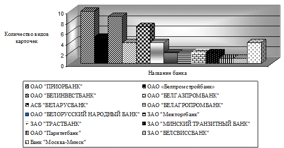 На основе проделанного анализа количества видов карточек в белорусских банках не трудно заметить, что лидерами являются, к сожалению, лишь 2 -3 банка, остальные банки Республики Беларусь не стремятся активно развивать спектр услуг по предоставлению клиентам пластиковых карточек.