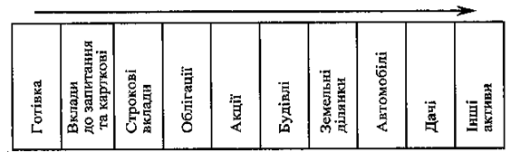 Усунути недоліки цих двох визначень грошей спробували прибічники так званого портфельного підходу до вивчення грошей. Вони використали умовний портфель активів окремого економічного суб'єкта, в якому всі активи розмістили в міру зниження їх ліквідності, тобто здатності до обміну (див. схему 2.2.1.).