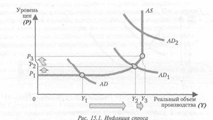Інфляція попиту простежується тоді, коли сукупний попит зростає швидше за виробничий потенціал економіки, а тому ціни підвищуються, щоб зрівноважити попит та пропозицію. Якщо причини дисбалансу знаходяться на стороні сукупного попиту, така інфляція називається інфляцією попиту. Інфляцію попиту можна представити графічно (мал. 1.1.1).