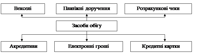 Рух безготівкових грошей здійснюється за допомогою певних кредитних засобів обігу й платежу. Це векселі, платіжні доручення (інкасо) при акцептній формі розрахунків та банківські перекази, розрахункові чеки різних видів (звичайні, акцептовані, з лімітованих або нелімітованих книжок), акредитиви, кредитні картки, електронні гроші. На чековий оборот у розвинутих країнах світу припадає майже 90% депозитного обігу. Див. схему 56.