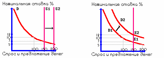 Итак, денежный рынок подчиняется законам спроса и предложения, и таким образом можно влиять на объемы денег в обращении при помощи влияния на банковский процент, на спрос денег и на предложение денег (напрямую).