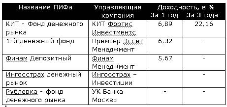 По данным на начало 2008 года, в России функционируют всего 5 ПИФа денежного рынка. (см. таблицу 1)