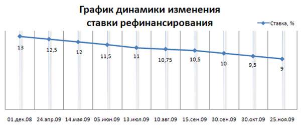 Динамика ставки рефинансирования в 2009 году имеет ярко выраженную тенденцию снижения. График, приведенный ниже, наглядно показывает как и какими темпами снижалась динамика ставки рефинансирования Банка России в 2009 году: