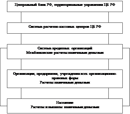 Денежное обращение подразделяется на налично-денежное и безналичное. Налично-денежный оборот организуется государством в лице Центрального Банка. Основными организующими звеньями в Российской Федерации являются также территориальные учреждения Центрального Банка и система расчетно-кассовых центров (РКЦ). В их составе имеются резервные фонды денежных знаков и монет, а также оборотные кассы по приему и выдаче наличных денег. РКЦ обслуживают расчетную деятельность банков, осуществляют инкассацию денег и проводят операции, связанные с денежным оборотом (рис. 1).