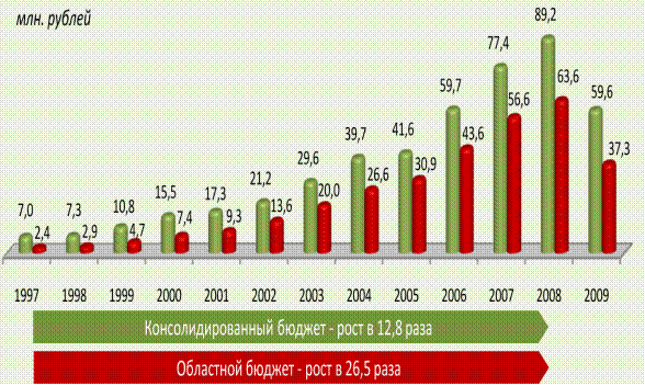 1997-2008 год — доходы бюджета области на одного жителя увеличились в 10 раз.