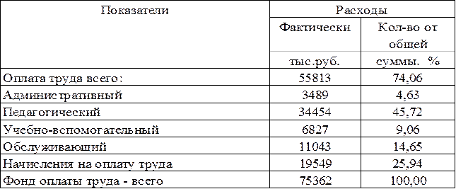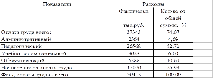 Из таблицы 4 следует, что основную долю фонда оплаты труда составляет оплата труда педагогическому персоналу 52,7%. Это свидетельствует о том, что основным персоналом на предприятии являются учителя.