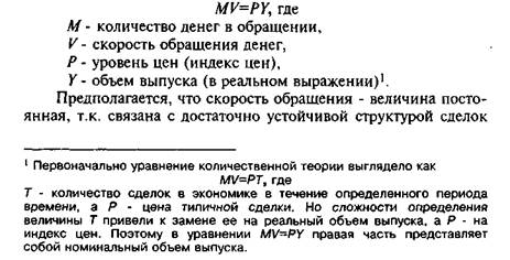 Приведенное выше уравнение количественной теории MV=PY называется уравнением Фишера. Используется и другая форма этого уравнения, так называемое кембриджское уравнение: M=kPY. Коэффициент k, однако, несет и собственную смысловую нагрузку, показывая долю номинальных денежных остатков (М) в доходе (PY). Строго говоря, величины У и k связаны с движением ставки процента1, но в данном случае для простоты принимаются постоянными. Кембриджское уравнение предполагает наличие разных видов финансовых активов с разной доходностью (а не только наличность или Ml) и возможность выбора между ними при решении вопроса, в какой форме хранить доход.