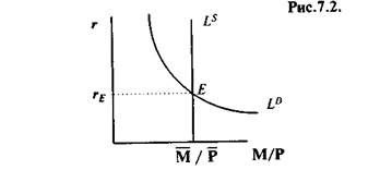 Спрос на деньги (кривая L ) рассматривается как убывающая функция ставки процента для заданного уровня дохода (при неизменном уровне цен номинальные и реальные ставки процента равны). В точке равновесия спрос на деньги равен их предложению.