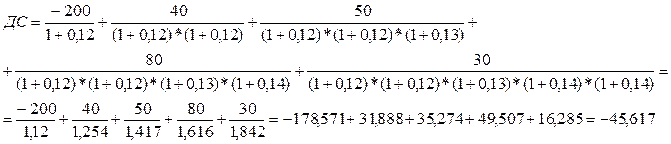Компания рассматривает инвестиционный проект со следующими условиями. Денежный поток по годам (млн.руб.): -200; 40; 50; 80; 30. Прогнозируемая стоимость капитала по годам: 12%; 12%;13%;14%; 14%