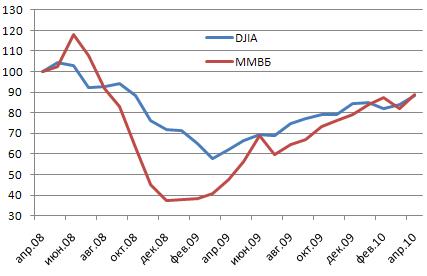 Рис 2. Российский фондовый индекс ММВБ в сравнении c американским индексом DЛА в процентах от значений апреля 2008 года