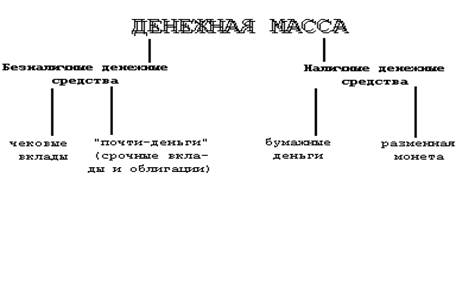 Выпуск как бумажных, так и кредитных денег оказался в современных условиях монополизирован государством. Центральный банк, находящийся в собственности государства, иногда пытается компенсировать нехватку денежных накоплений путем увеличения денежной массы, эмиссии избыточных знаков стоимости. Денежная масса — это совокупность наличных и безналичных покупательных и платежных средств, обеспечивающих обращение товаров и услуг в народном хозяйстве, которым располагают частные лица, институциональные собственники и государство. В структуре денежной массы выделяется активная часть, к которой относятся денежные средства, реально обслуживающие хозяйственный оборот, и пассивная часть, включающая денежные накопления, остатки на счетах, которые потенциально могут служить расчетными средствами (см. рисунок 1).