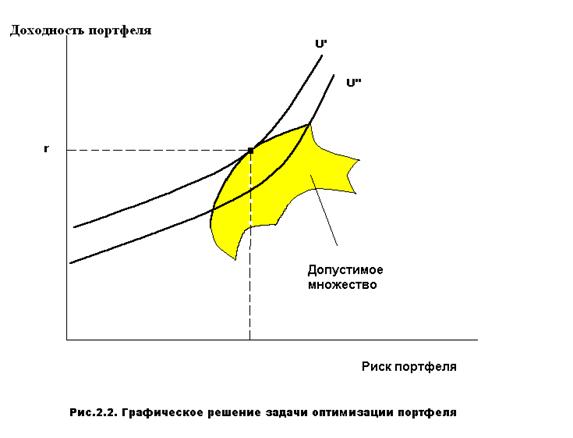 будет соответствовать множество всевозможных портфелей, составленных из n ценных бумаг в виде характерного «зонтика» (рис. 2.2). Однако для рационального инвестора выбор ограничен только линией эффективного фронта , точки которого в соответствии с гипотезами о ненасыщаемости и несклонности к риску лежат на северо-западной границе допустимого множества портфелей. Графическим решением задачи оптимального размещения капитала является нахождение точки касания эффективного фронта с самой удаленной влево и вверх кривой безразличия инвестора. Эта точка и представляет сочетание риска и доходности оптимального портфеля в соответствии с индивидуальным предпочтением инвестора, как показано на рис. 2.2.
