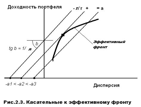 Для описания эффективного фронта используется вспомогательная прямая, идея которой состоит в том, что она является касательной к эффективному фронту, тогда, изменяя наклон этой касательной от минимального до максимального значения, можно получить описание всего эффективного фронта как совокупность точек касания. Итак, на плоскости